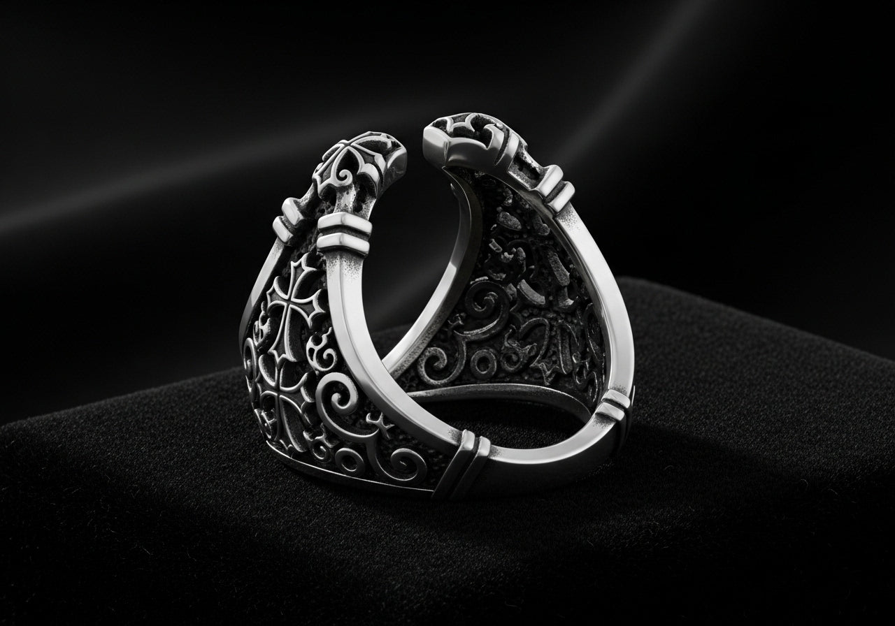 Rugged, rebellious, and carved with purpose — the Iron Creed Ring fuses medieval energy with streetwear edge. Featuring engraved cross insignias and ornate detailing across a thick silver band, this piece commands attention without saying a word.